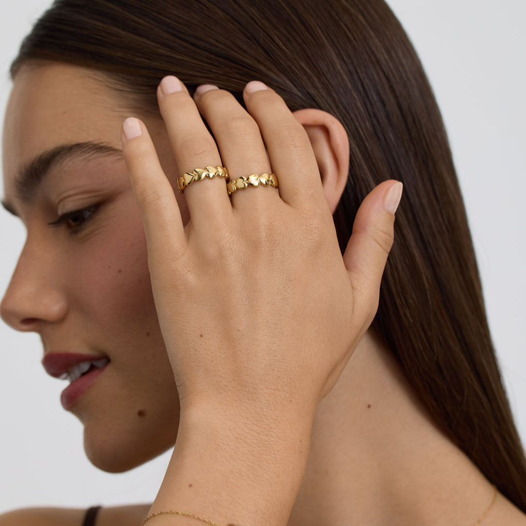 Details: A slim band dotted with delicate mini hearts - designed for stacking, styling, and wearing every day. Subtle detail, endless versatility.