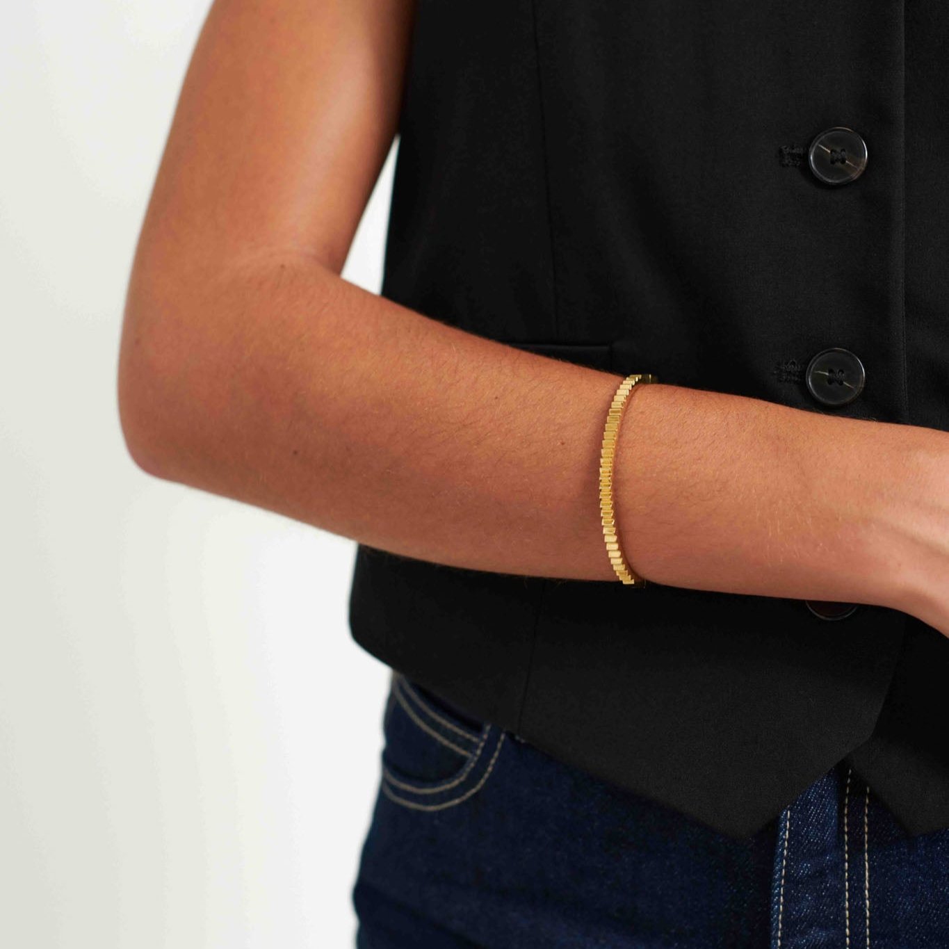 Details: A modern twist on the classic bangle. Featuring a gold pleated design, this sleek and stylish design adds a touch of elegance to any outfit.