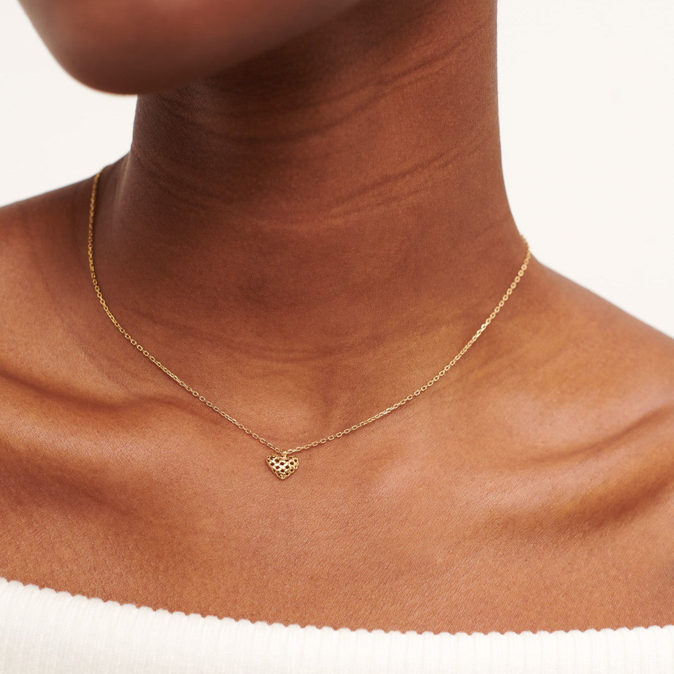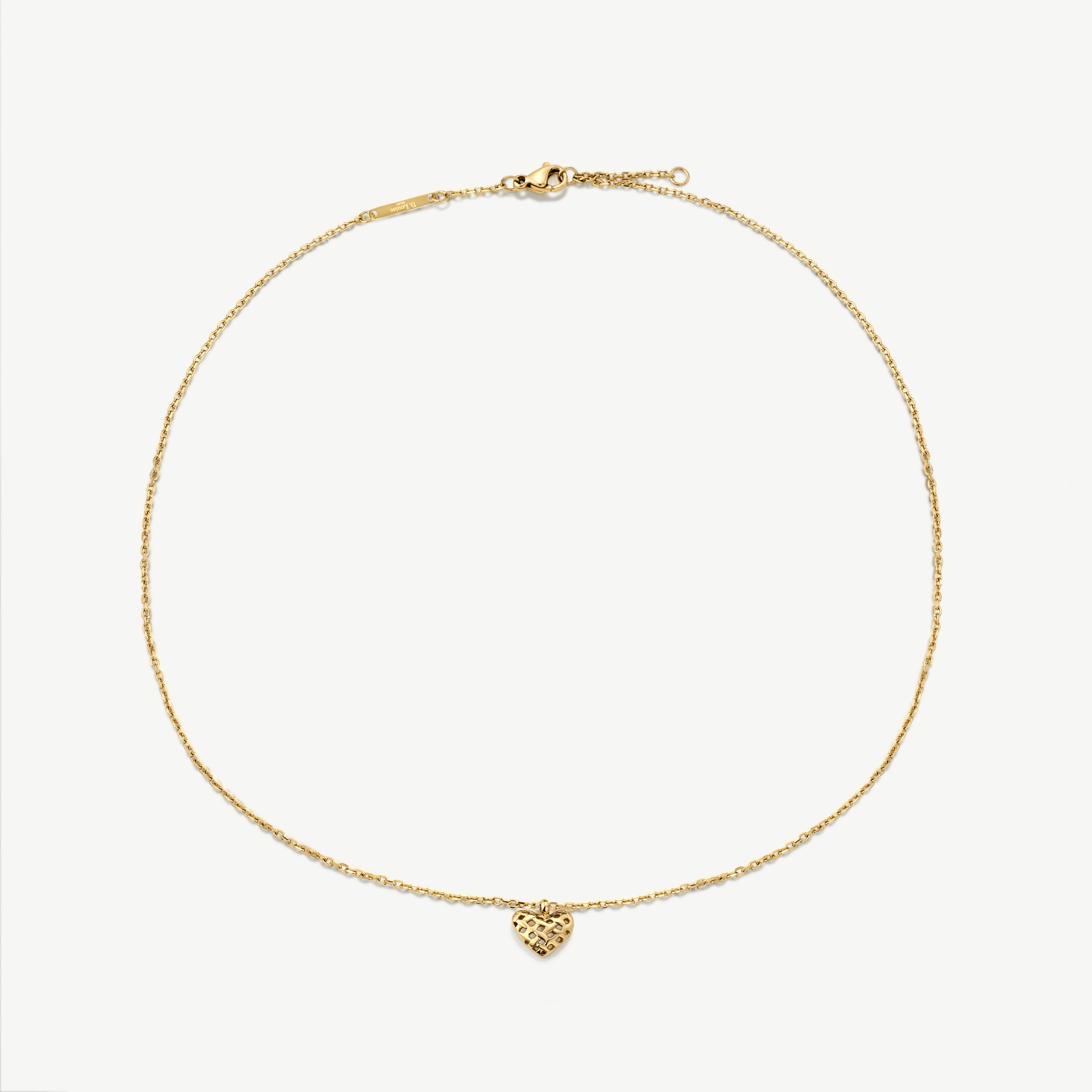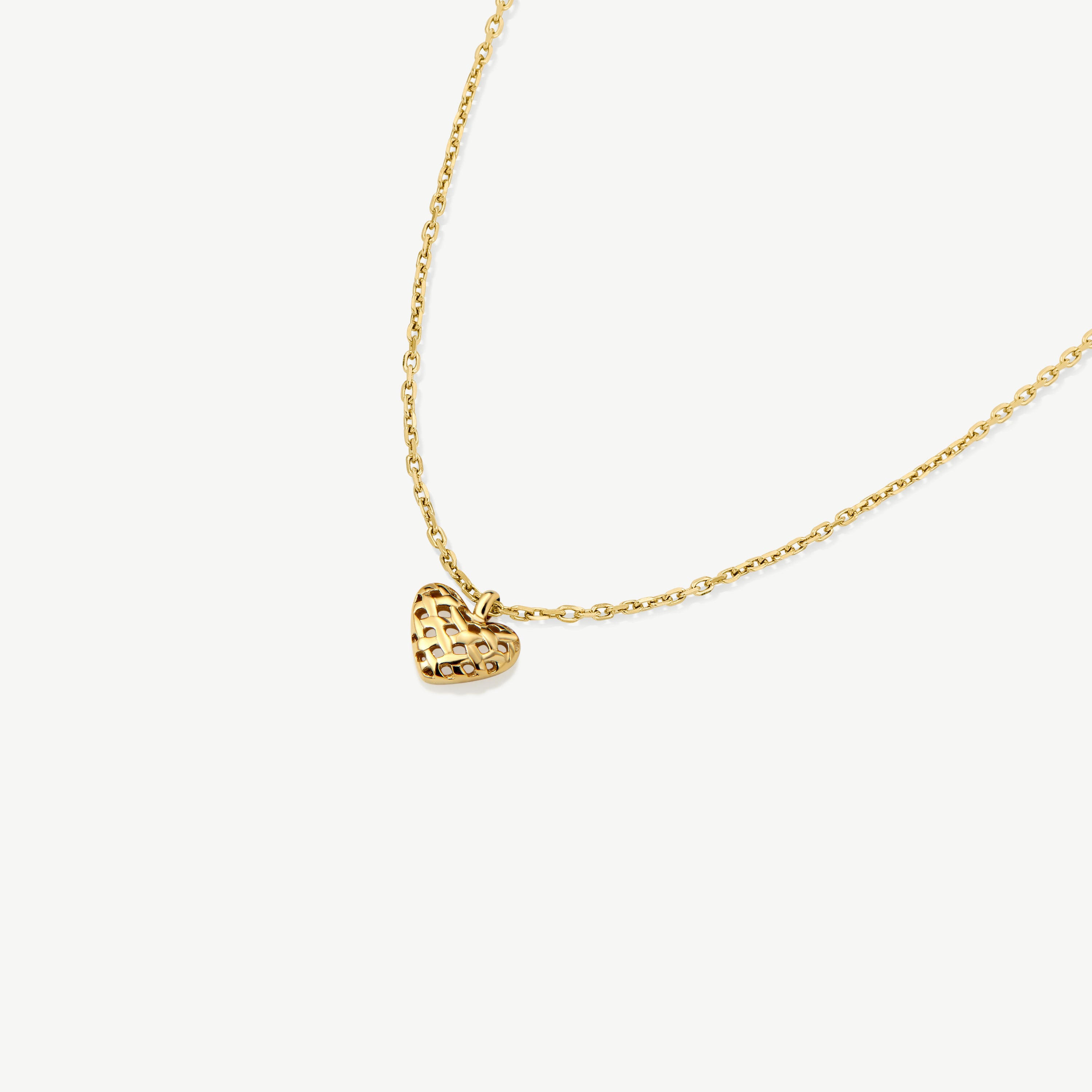This Woven Heart Pendant is a beautiful and modern take on a classic piece. The intricate woven details add a unique touch to the heart shaped design.