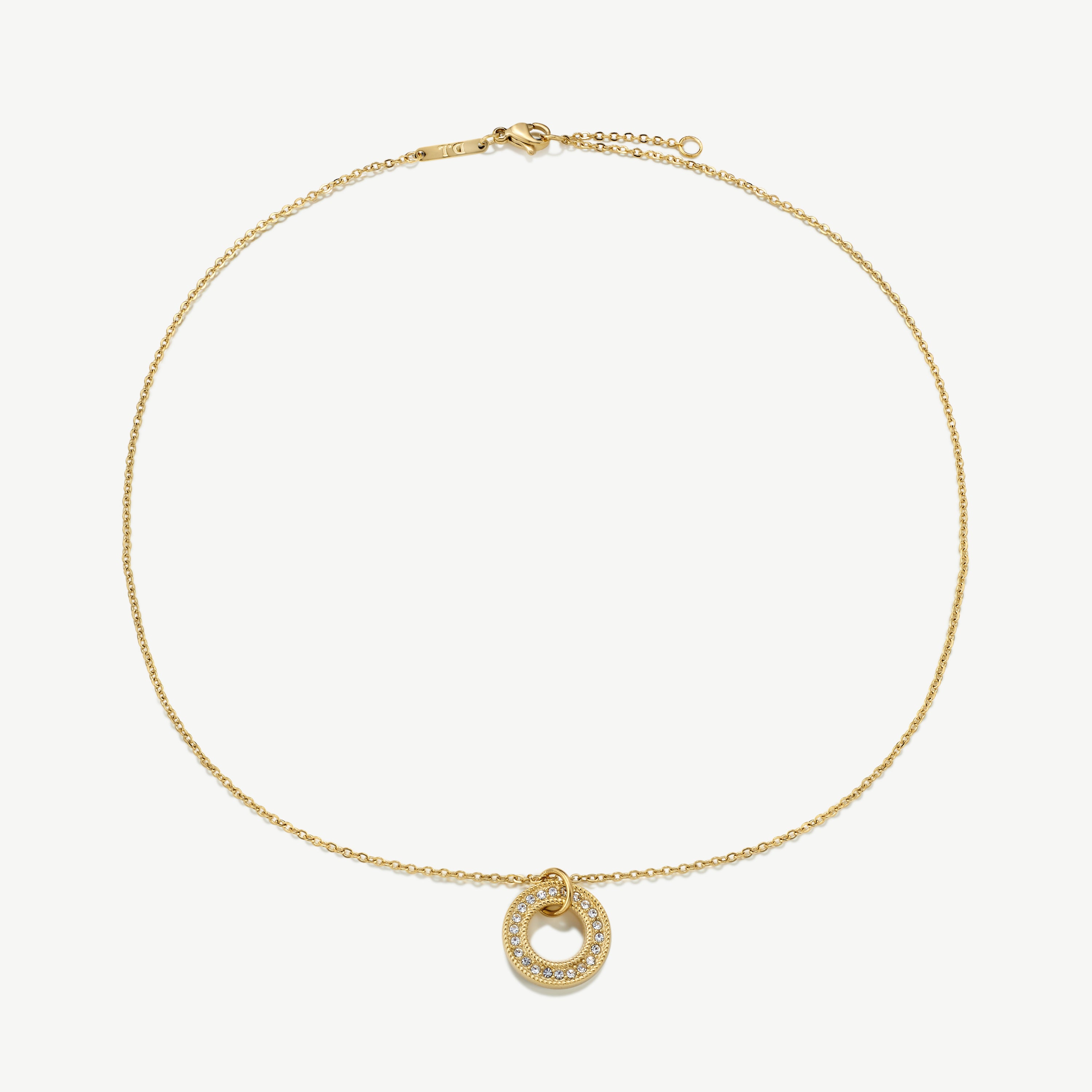This elegant pendant necklace features a stunning outline design with intricate pavé embellishments and textured details.