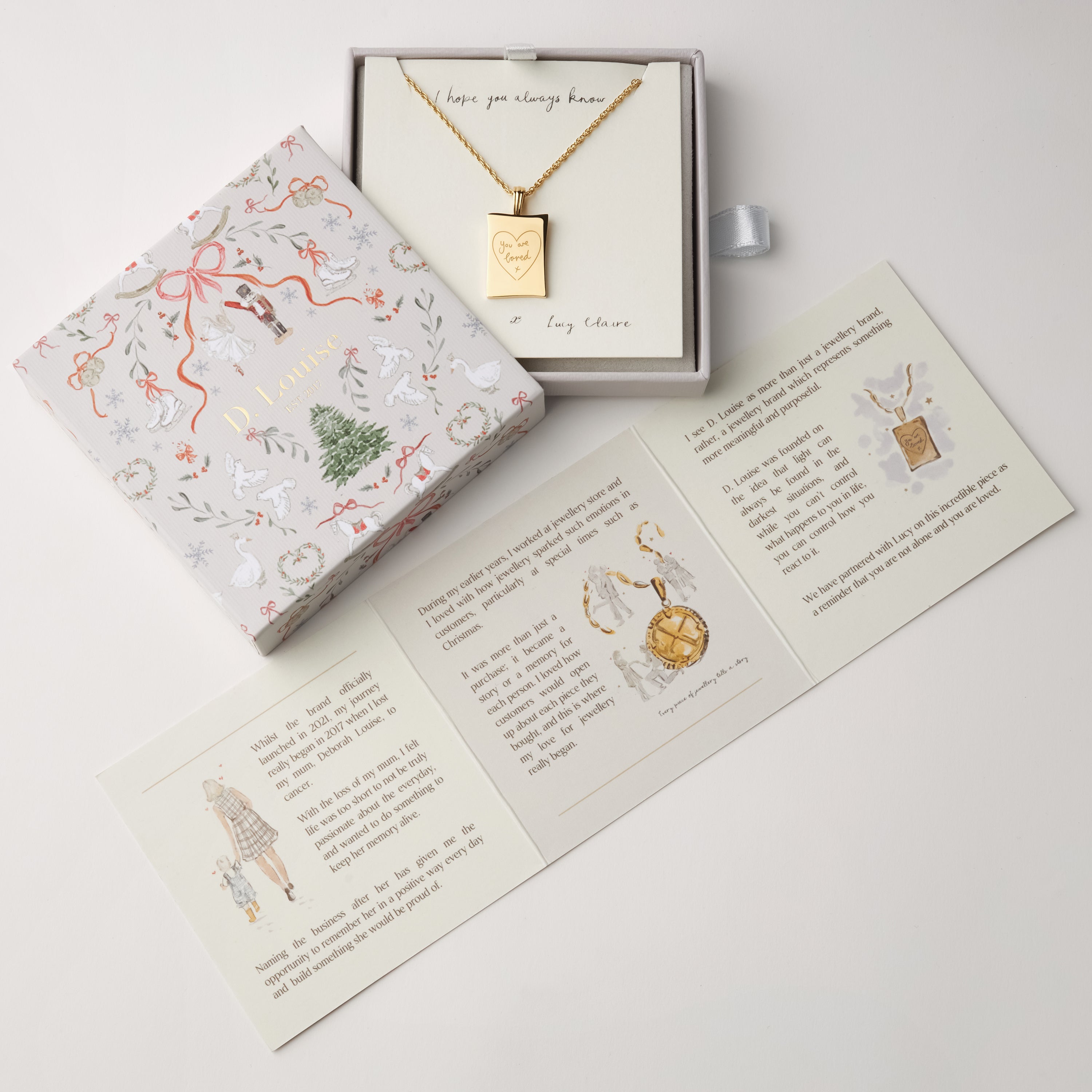 Details: The limited edition You Are Loved Pendant, created in collaboration with Lucy Claire Illustrator, makes the perfect Christmas gift to show someone how much they mean to you. This piece comes with a special edition D. Louise box, making it the ultimate Christmas piece.