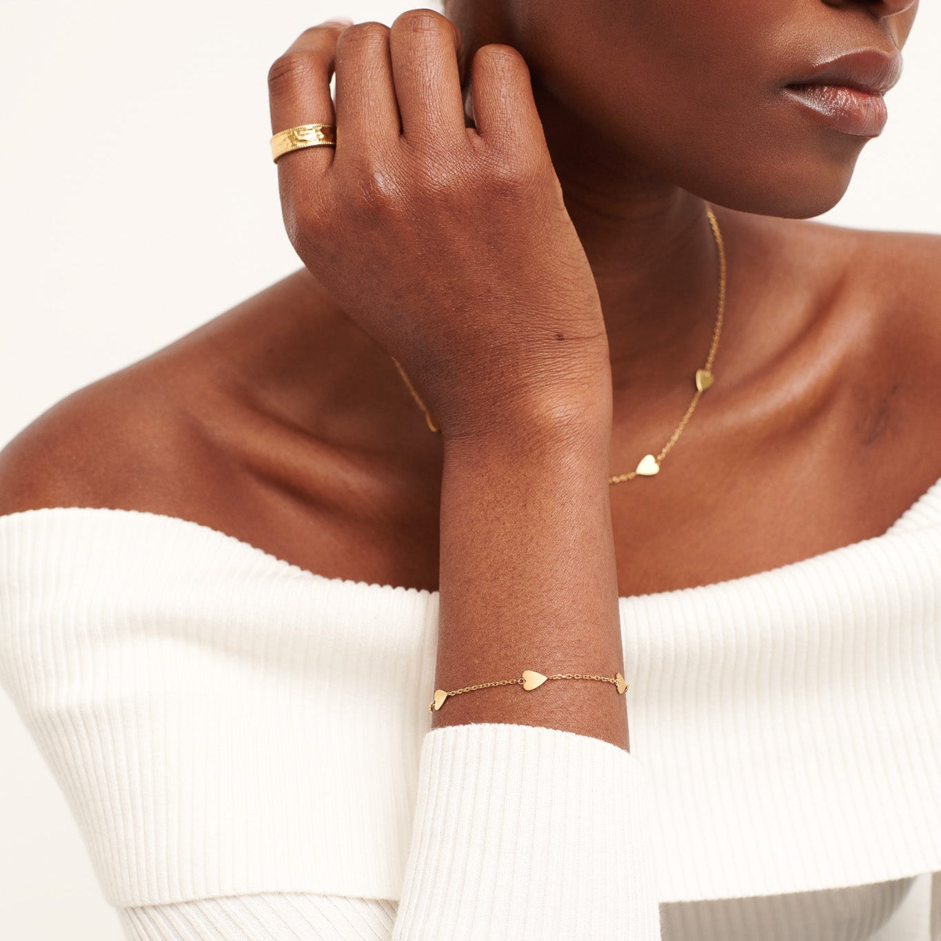 A little love, wrapped in gold. This bracelet features dainty heart charms and comes with a meaningful card, making it the perfect gift for someone special.