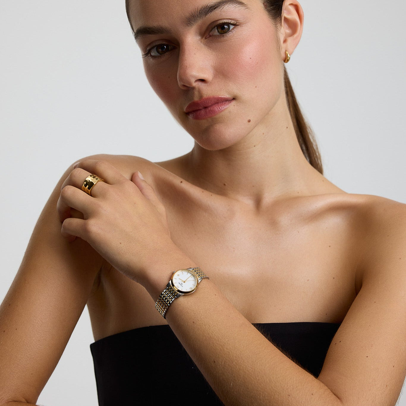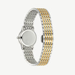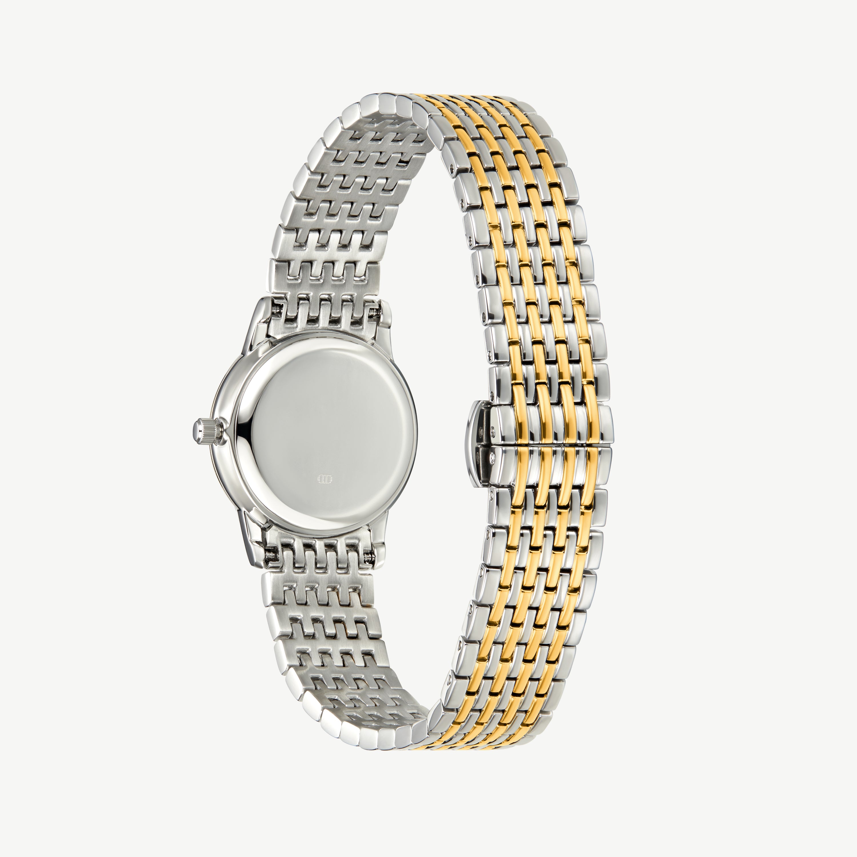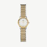 The Classic Link Round Bi-Metal Watch features a two-tone woven bracelet and softly rounded case, merging warm gold and cool silver for an effortlessly versatile finish.