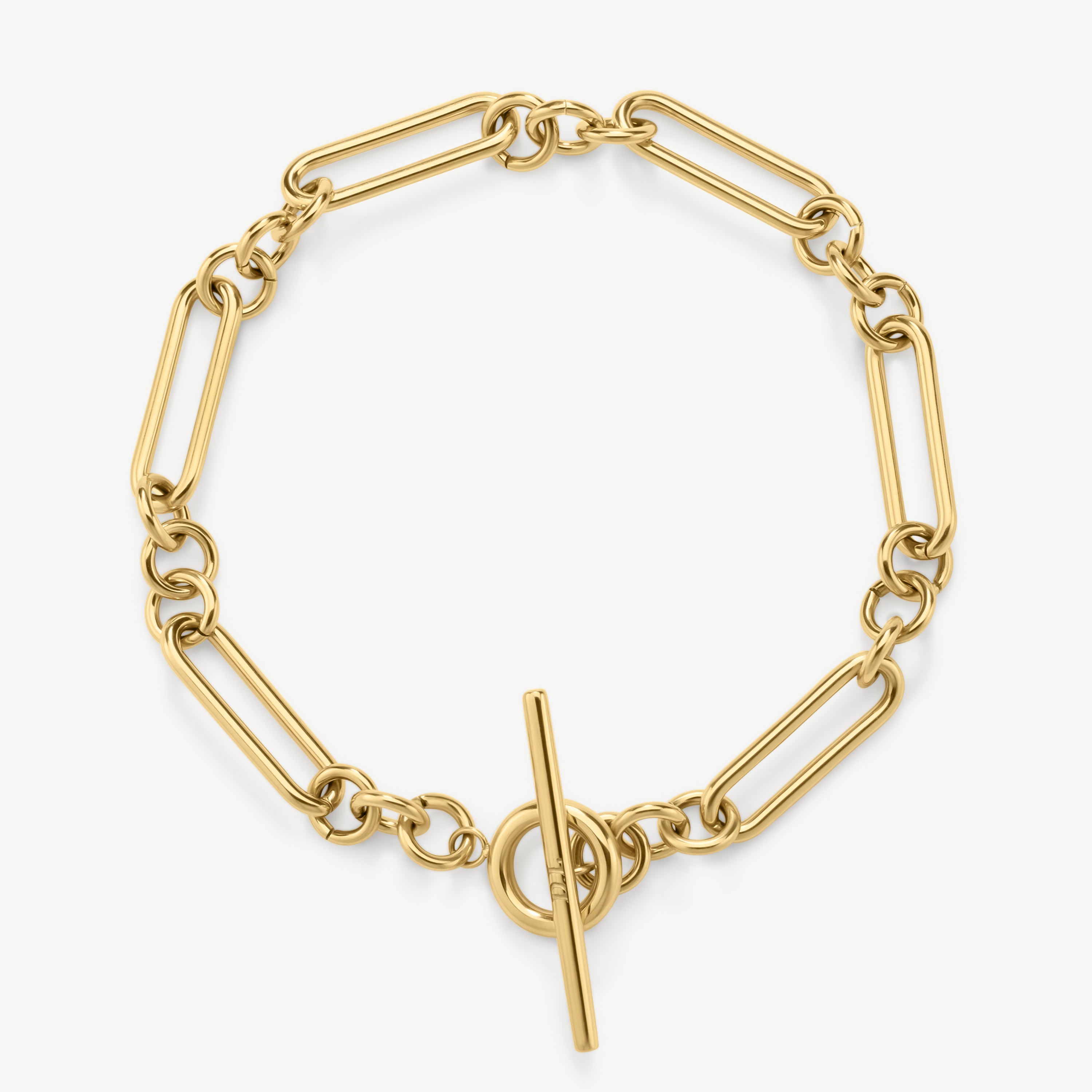 Crafted from waterproof, tarnish-free stainless steel, each link catches the light just so, finished with a bold T-bar clasp that makes it effortlessly wearable (and stackable).