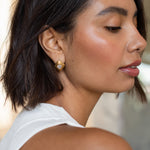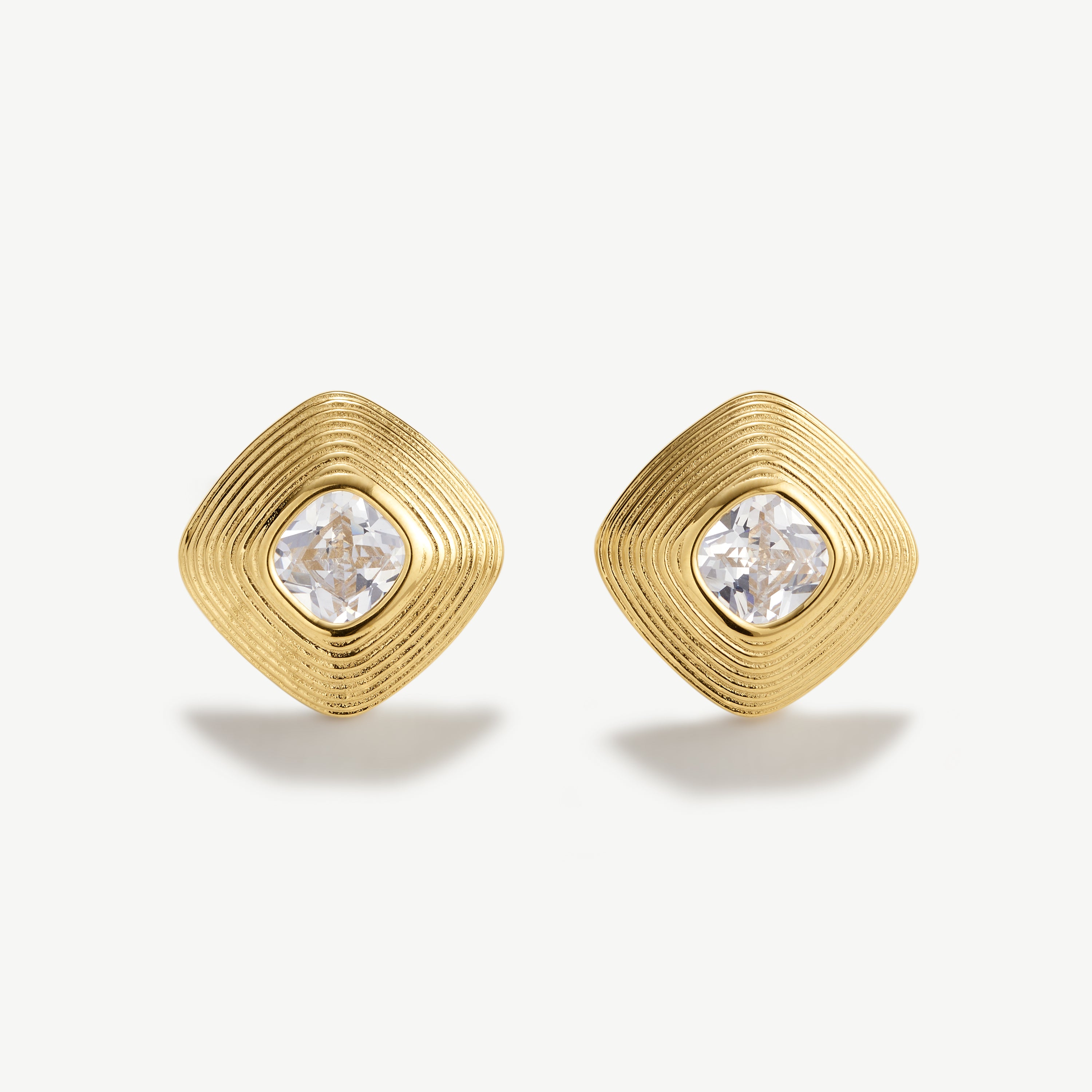 These bezel stud earrings feature a statement cubic zirconia stone, accented by a delicate gold ribbed outline.